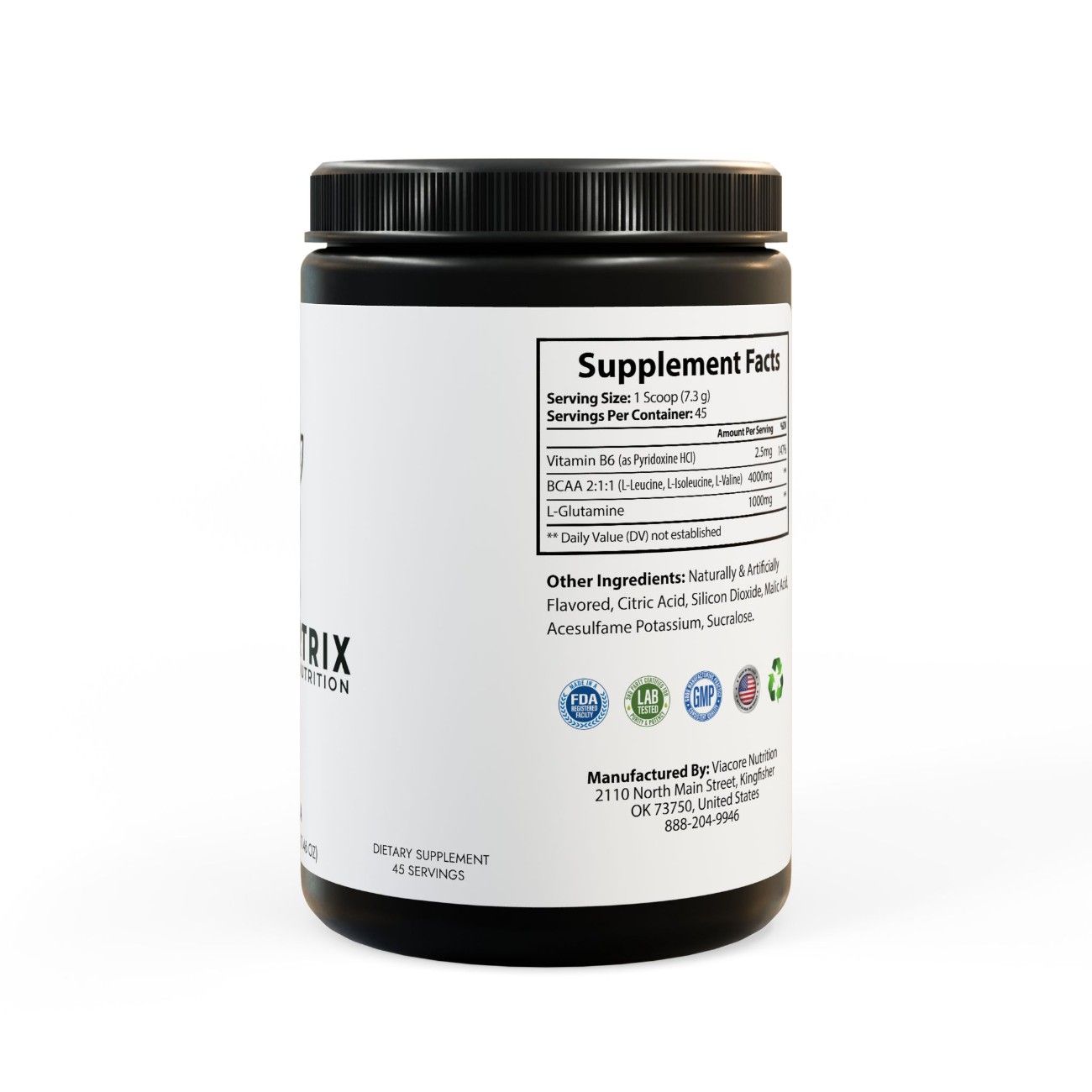Ingredients: Vitamin B6 (as Pyridoxine HCl), BCAA 2:1:1 (L-Leucine, L-Isoleucine, L-Valine), L-Glutamine. Other Ingredients: Naturally & Artificially Flavored, Citric Acid, Silicon Dioxide, Malic Acid, Acesulfame Potassium, Sucralose.