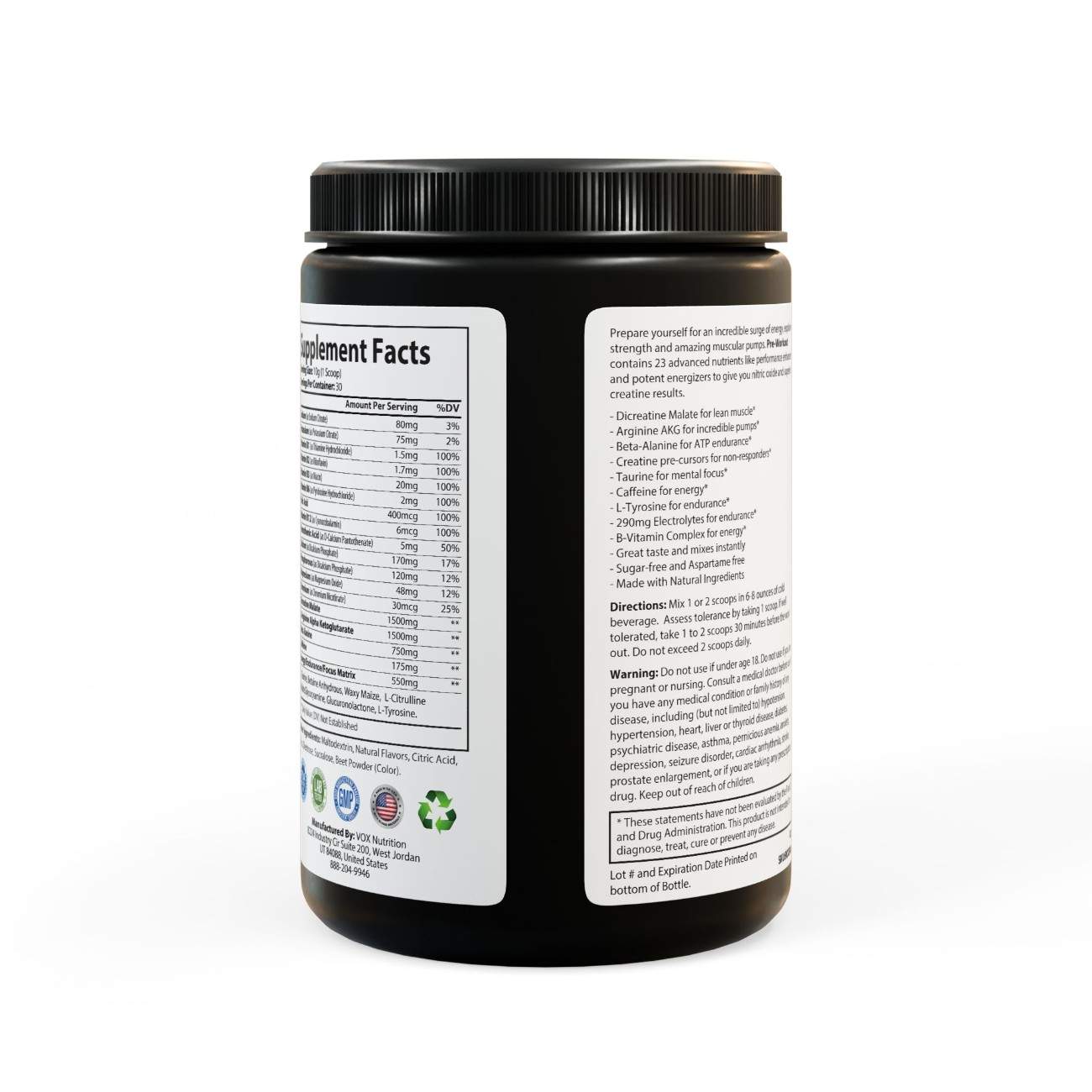 Ingredients: Sodium (as Sodium Citrate), Potassium (as Potassium Citrate), Vitamin B1 (as Thiamine Hydrochloride), Vitamin B2 (as Riboflavin), Vitamin B3 (as Niacin), Vitamin B6 (as Pyridoxine Hydrochloride), Folic Acid, Vitamin B12 (as Cyanocobalamin), Pantothenic Acid (as D-Calcium Pantothenate), Calcium (as Dicalcium Phosphate), Phosphorous (as Dicalcium Phosphate), Magnesium (as Magnesium Oxide), Chromium (as Chromium Nicotinate), Dicreatine Malate, L-Arginine Alpha Ketoglutarate, Beta Alanine, Caffeine, L-Taurine, Betaine Anhydrous, Waxy Maize, L-Citrulline, Malate, Glycocyamine, Glucuronolactone, L-Tyrosine. Other Ingredients: Maltodextrin, Natural Flavors, Citric Acid, Silica, Dextrose, Sucralose, Beet Powder (Color).