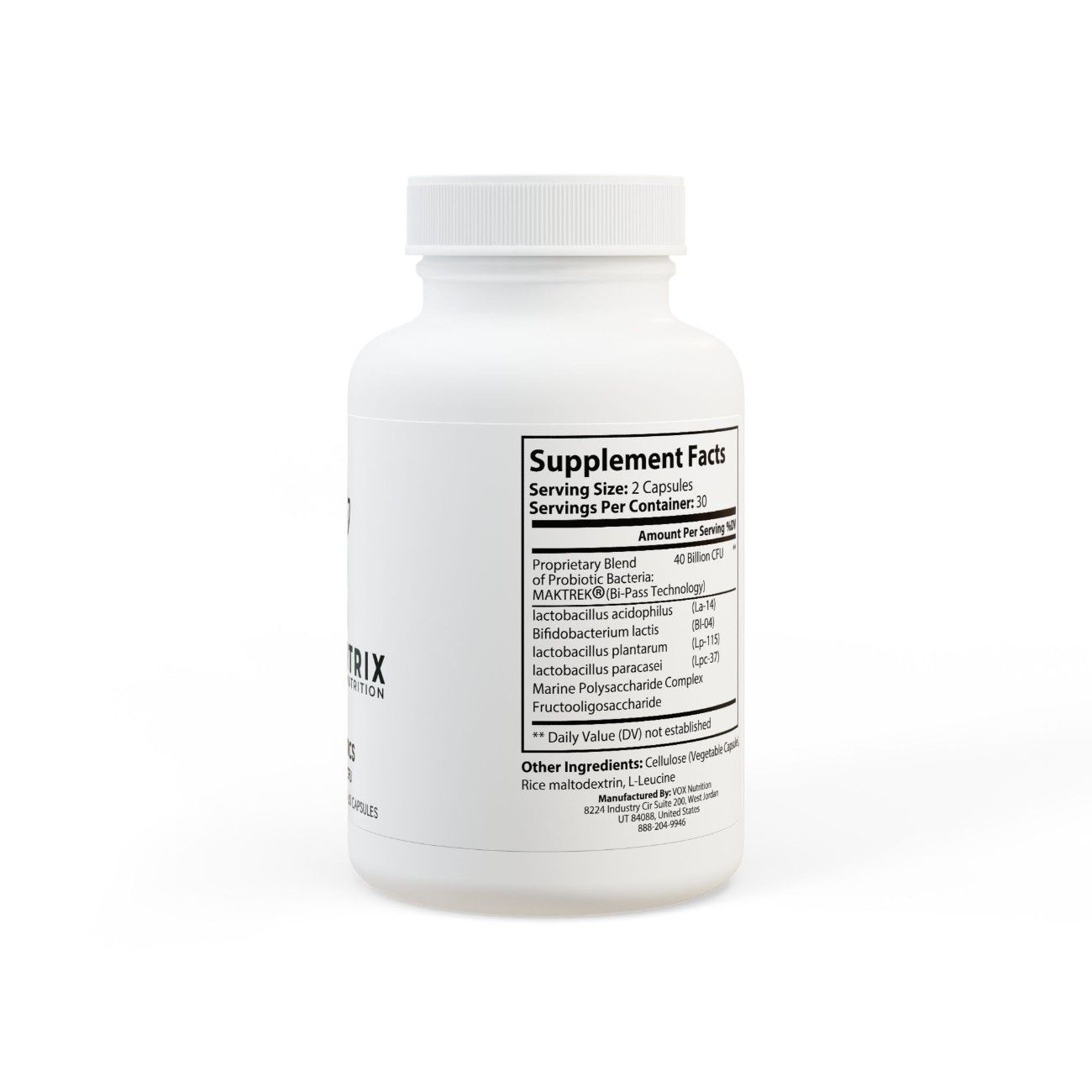 Key ingredients include a Proprietary Blend of Probiotic Bacteria with MAKTREK? (Bi-Pass Technology), Lactobacillus acidophilus, Bifidobacterium lactis, Lactobacillus plantarum, Lactobacillus paracasei, Marine Polysaccharide Complex, and Fructooligosaccharide? (FOS).
